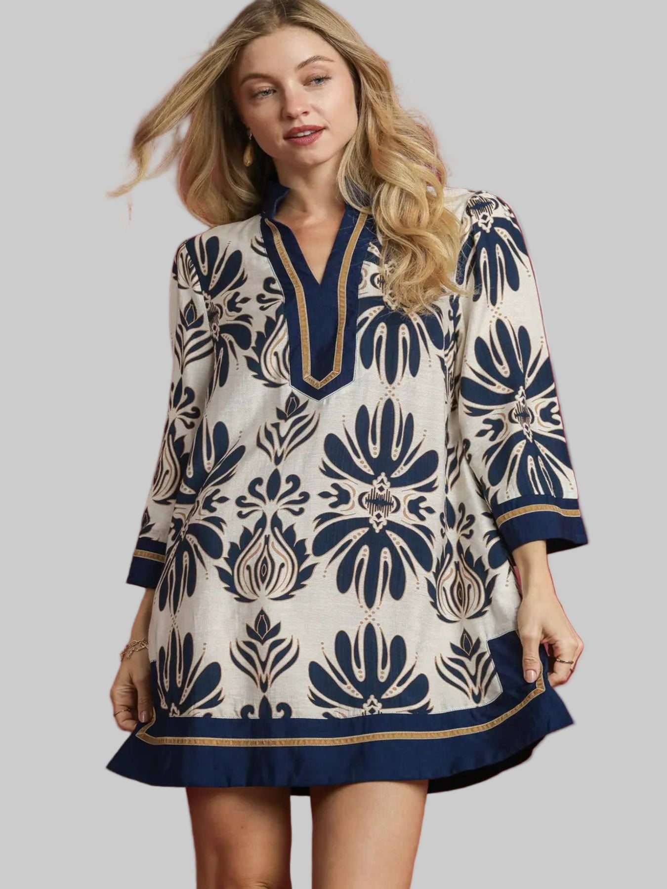 Step out boldly in the Tiana Dress, where navy blue meets cream and caramel accents for a striking contrast. Featuring a sophisticated geometric-patterned collar, this dress commands attention with its daring design. Perfect for those who dare to stand out, the Tiana Dress blends elegance with edgy detail.