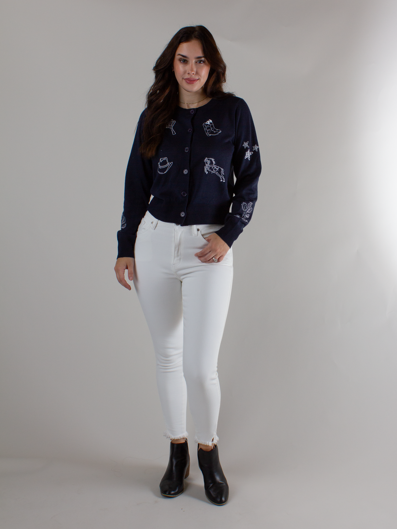 Embrace a bold blend of western charm and cozy sophistication with the Diana Cardigan. Featuring a navy embroidered design inspired by cowboy boots, hats, and majestic horses, this cardigan adds a unique, eye-catching touch to your wardrobe. Perfect for those who want to showcase their love for equestrian style while enjoying warmth and comfort in every wear. Make a statement that’s both classic and contemporary.