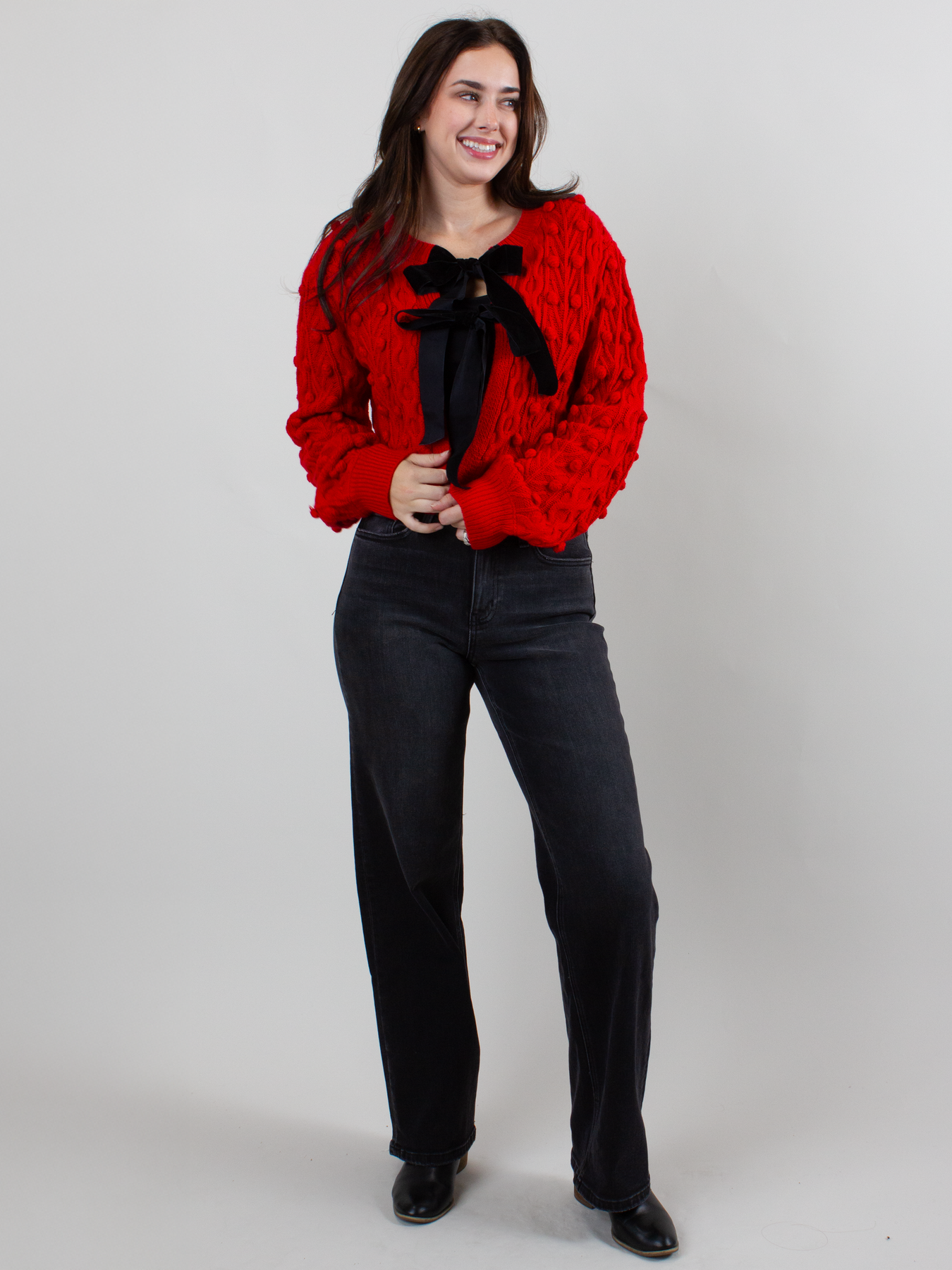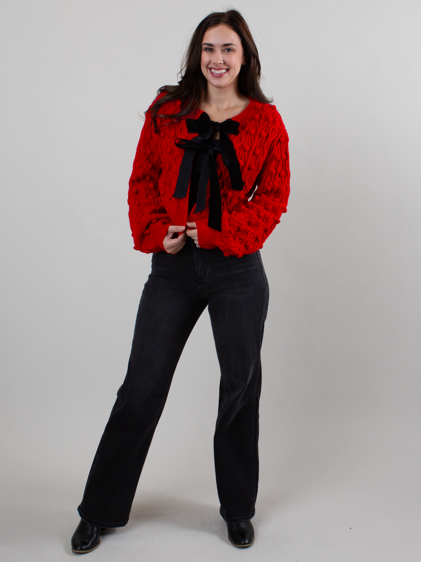 Popcorn knit cardigan with velvet bow closure. Available in Red, White, or Black.