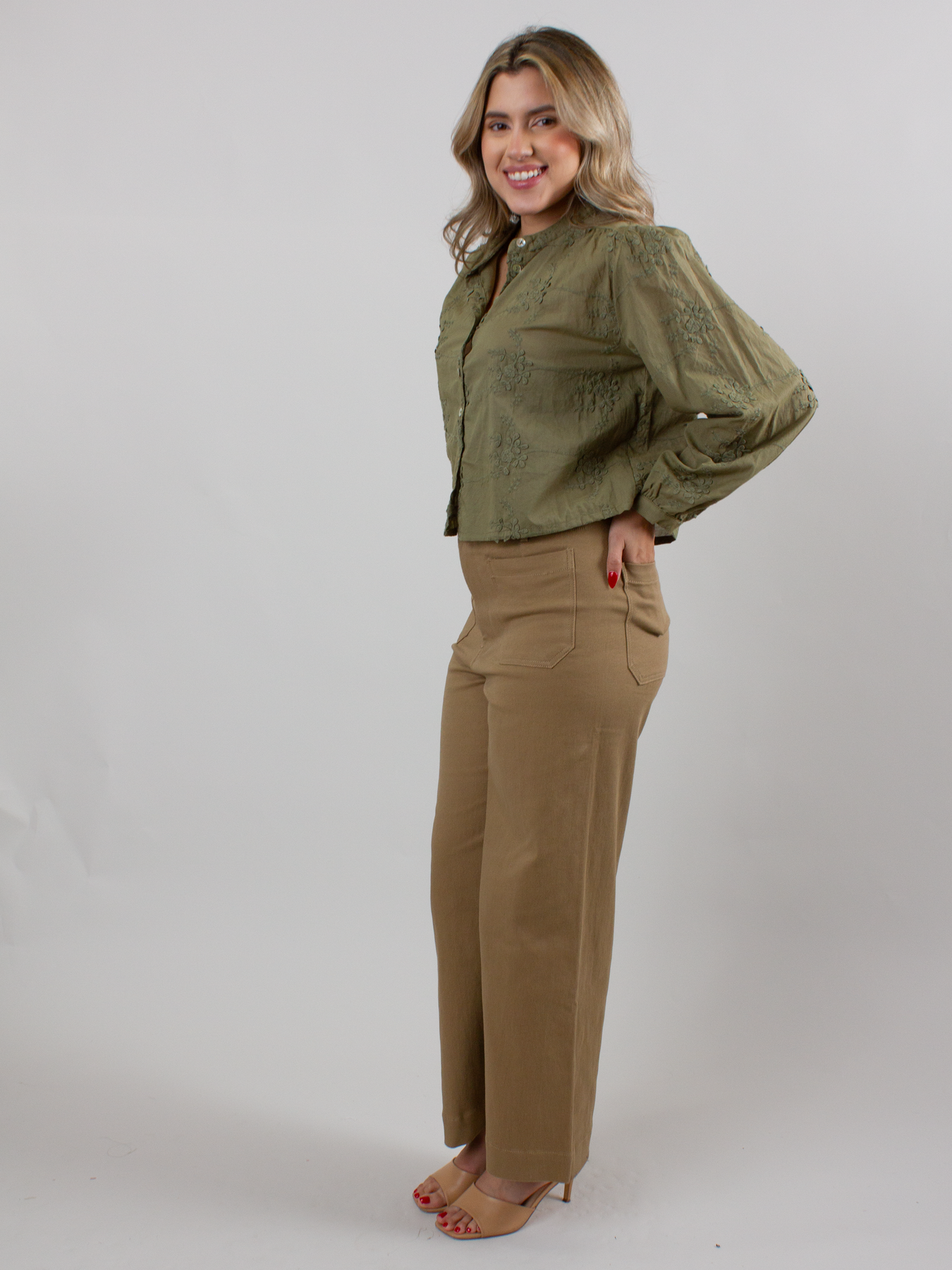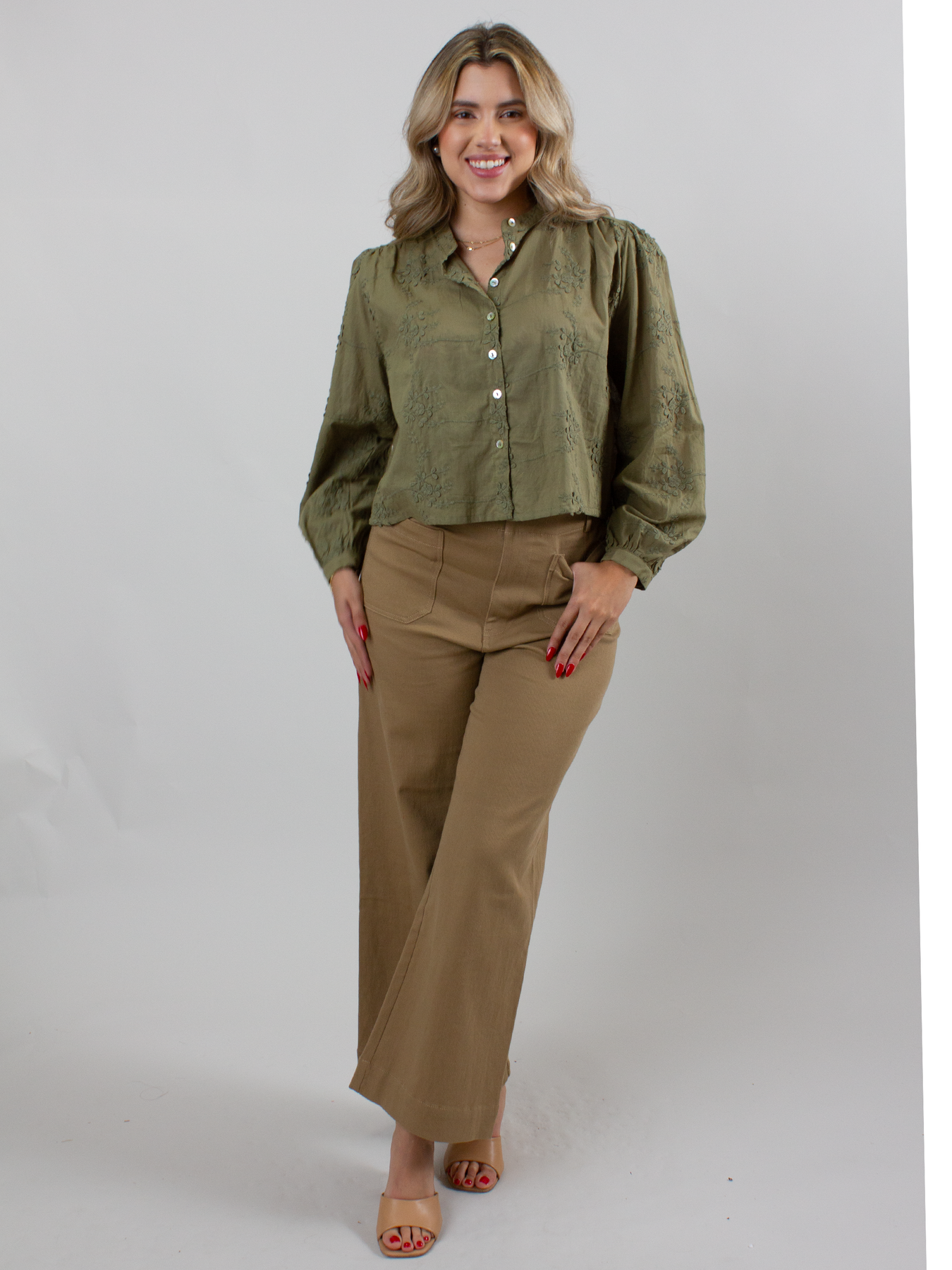 Elevate your wardrobe with this olive green 3D Flower Top, featuring a flattering button-front design and long sleeves for versatile style. The textured floral details add a unique touch, perfect for making a subtle statement. Comfortable and chic, it pairs effortlessly with jeans or skirts, making it ideal for both casual outings and dressier occasions.