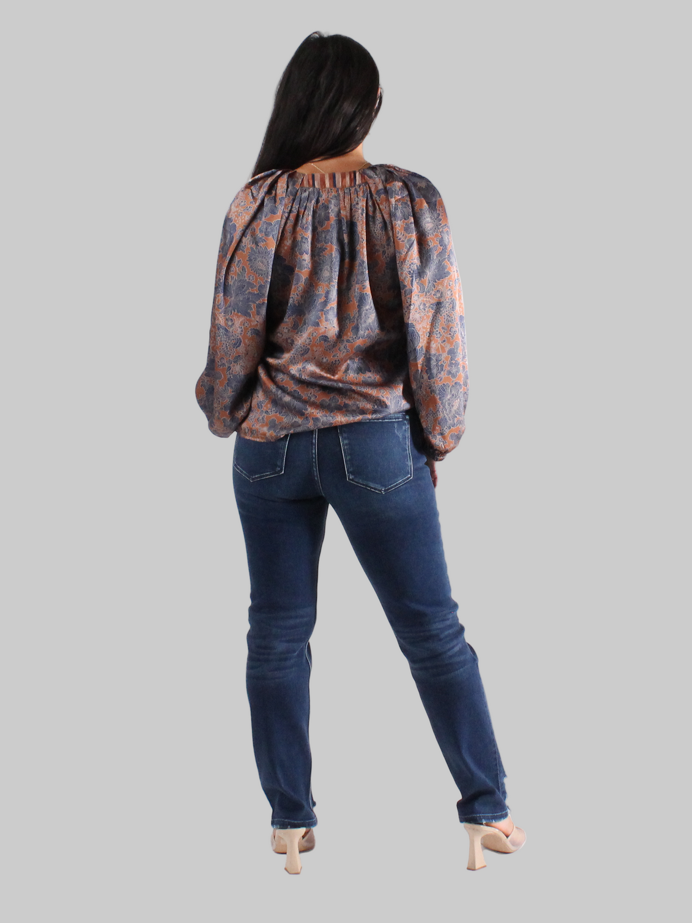 The Amber V-Neck blouse combines luxurious satin fabric with a striking burnt orange hue, accented by an elegant blue floral design. Its smooth texture and vibrant colors create a bold yet sophisticated statement, perfect for adding a touch of warmth and style to any outfit. Whether dressed up or down, this blouse enhances your look with a unique blend of comfort and eye-catching detail.