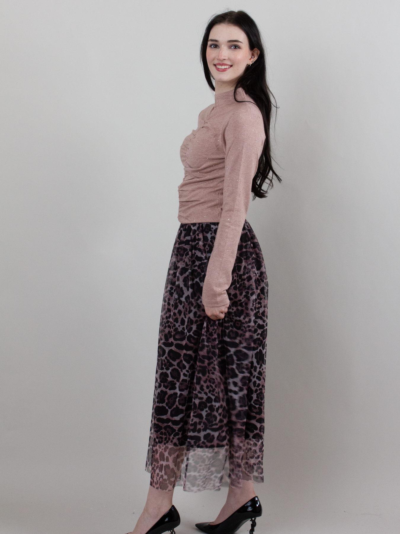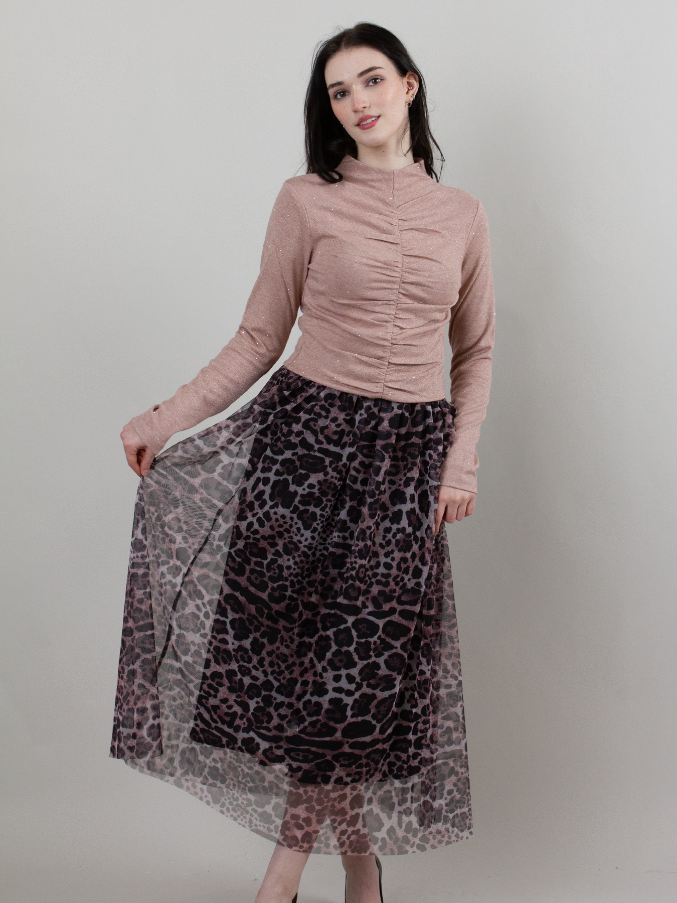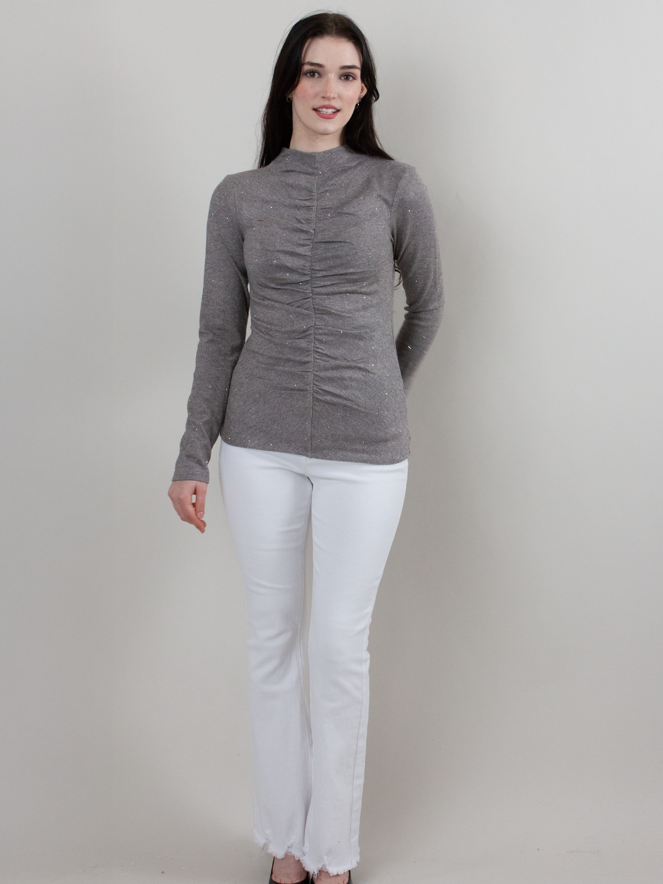The Misty Top brings effortless glamour to your wardrobe with its eye-catching sparkly fabric and flattering ruched design. Long sleeves and a chic mock neck create a refined look that works for countless occasions, while the shimmering details ensure you'll turn heads wherever you go. Perfect for those moments when you want to feel confident and radiant, this top pairs beautifully with everything from tailored trousers to your favorite jeans. Invest in a piece that delivers both style and versatility.