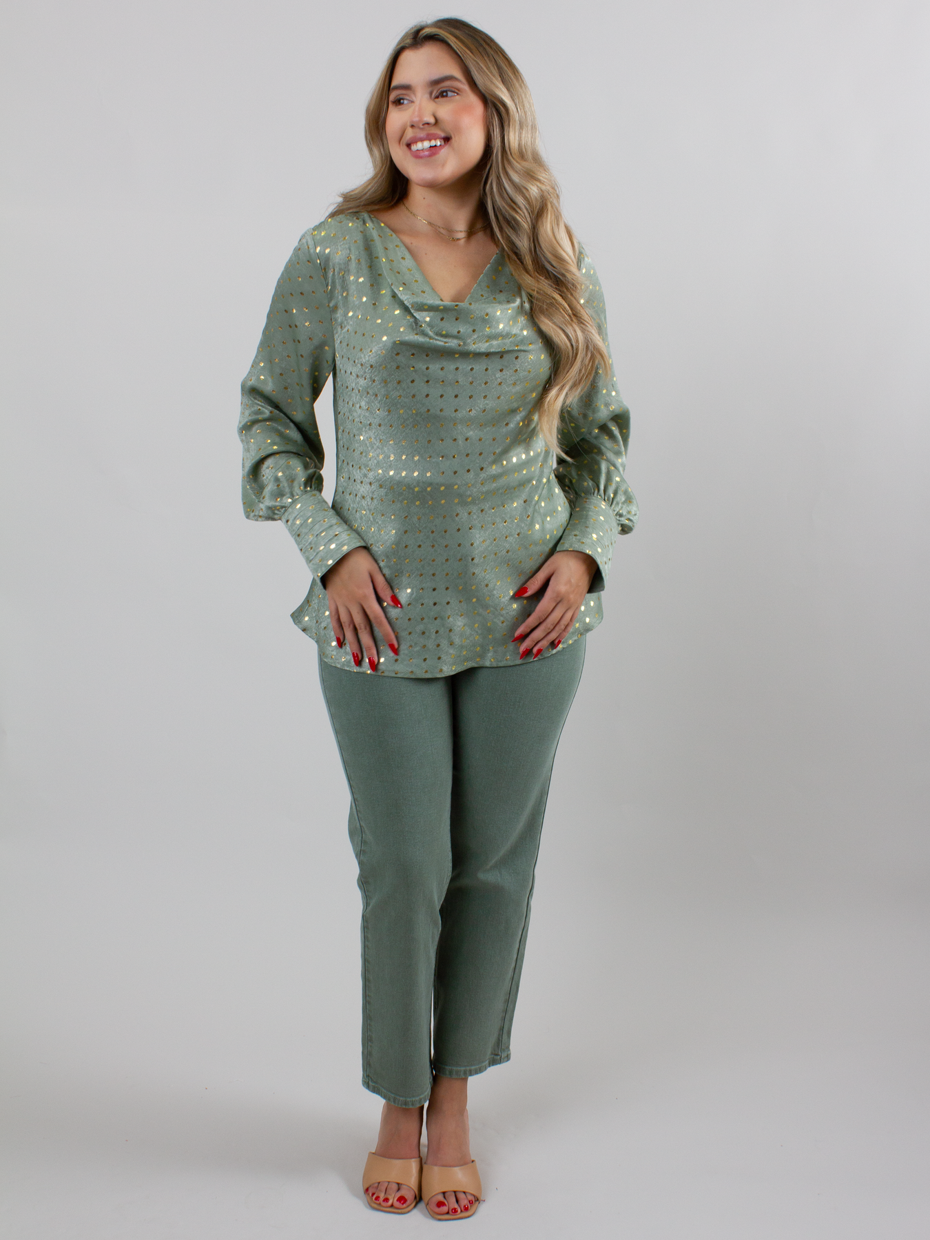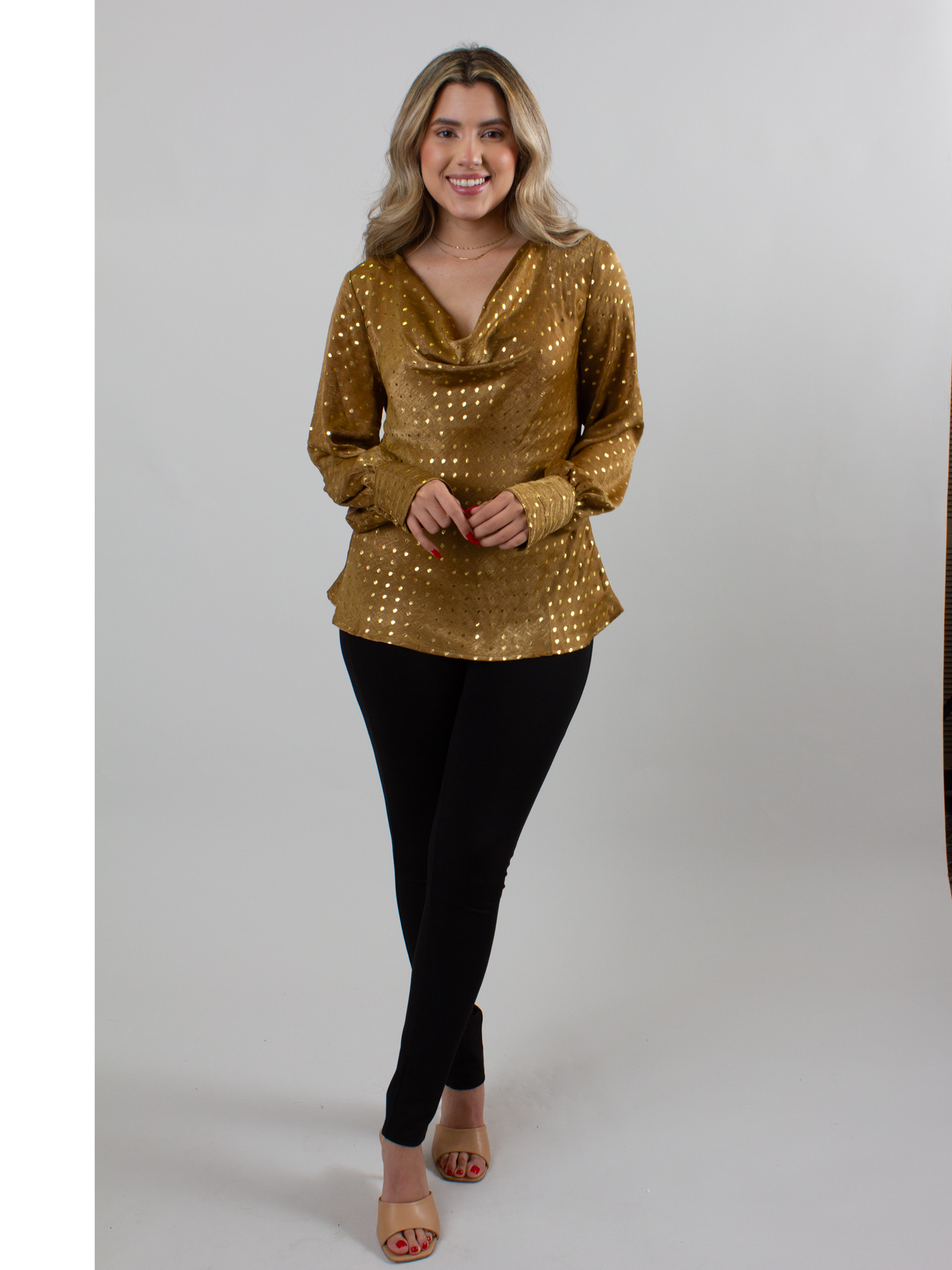 The Hocus Pocus Top shines with its metallic polka dot pattern set against sleek long sleeves, perfectly complemented by a graceful cowl neck. This top effortlessly adds a dazzling touch to your outfit while providing a comfortable fit, making it ideal for turning heads at any event. Embrace elegance and sparkle in one stunning piece.