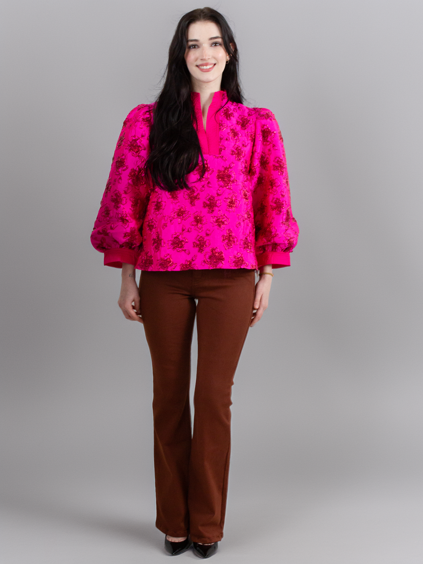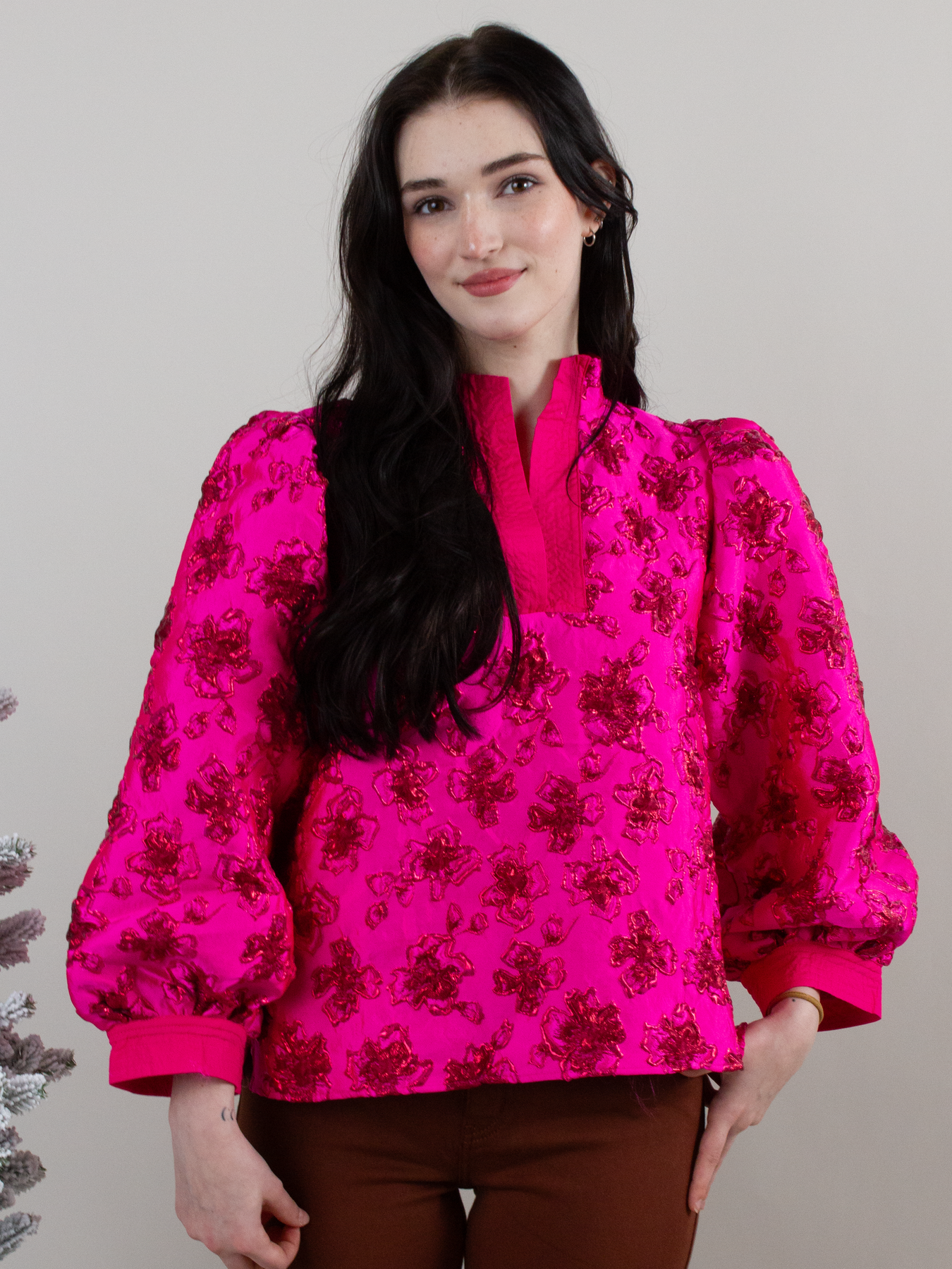Turn heads in the Violet Top, a captivating hot pink v-neck designed to make you feel confident and radiant. Intricate floral embroidery details bring artistic sophistication to the neckline and bodice, while romantic puff sleeves add dimension and movement to your silhouette. The flattering v-neckline elongates your frame beautifully, creating an instantly polished look whether you're dressing up for an event or elevating your everyday style. Versatile enough to pair with jeans, skirts, or trousers, this piece becomes an essential go-to that effortlessly transitions from season to season. Invest in a top that celebrates your unique personality and keeps you looking effortlessly chic.